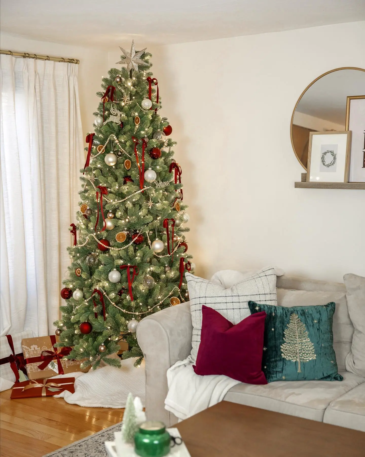 The Royal Fir Slim Christmas tree by King of Christmas is one of our premier, hallmark trees that is waiting to grace your home this Christmas. Known as one of the most high-end types of Christmas trees, the Royal Fir Slim is the epitome of grandeur and majestic splendor bringing a regal quality to your Christmas display. This signature tree features an artful blend of realistic tips (PE) and classic tips (PVC) which combine to create the ultimate in realism. With a strong metal core and included metal stand, you can hang as many ornaments as you dare with confidence. Your tree will stand strong and tall all season long while imbuing your home with the magic and elegance of one of the best Christmas trees in our collection.
