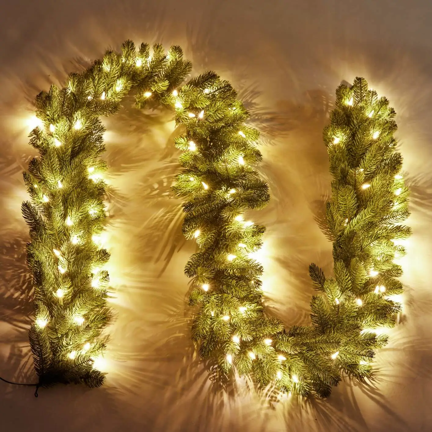 Appropriate for indoor and outdoor use. The royal fir wreath is pre-strung with 100 warm white LED lights, includes a female plug at the end to connect additional garlands. The flexible material makes it easy to wrap through a banister, hang around the fireplace, or around a door frame. Create a warm ambiance and elegant Christmas display right inside your home with the majestic and striking Royal Fir garland.