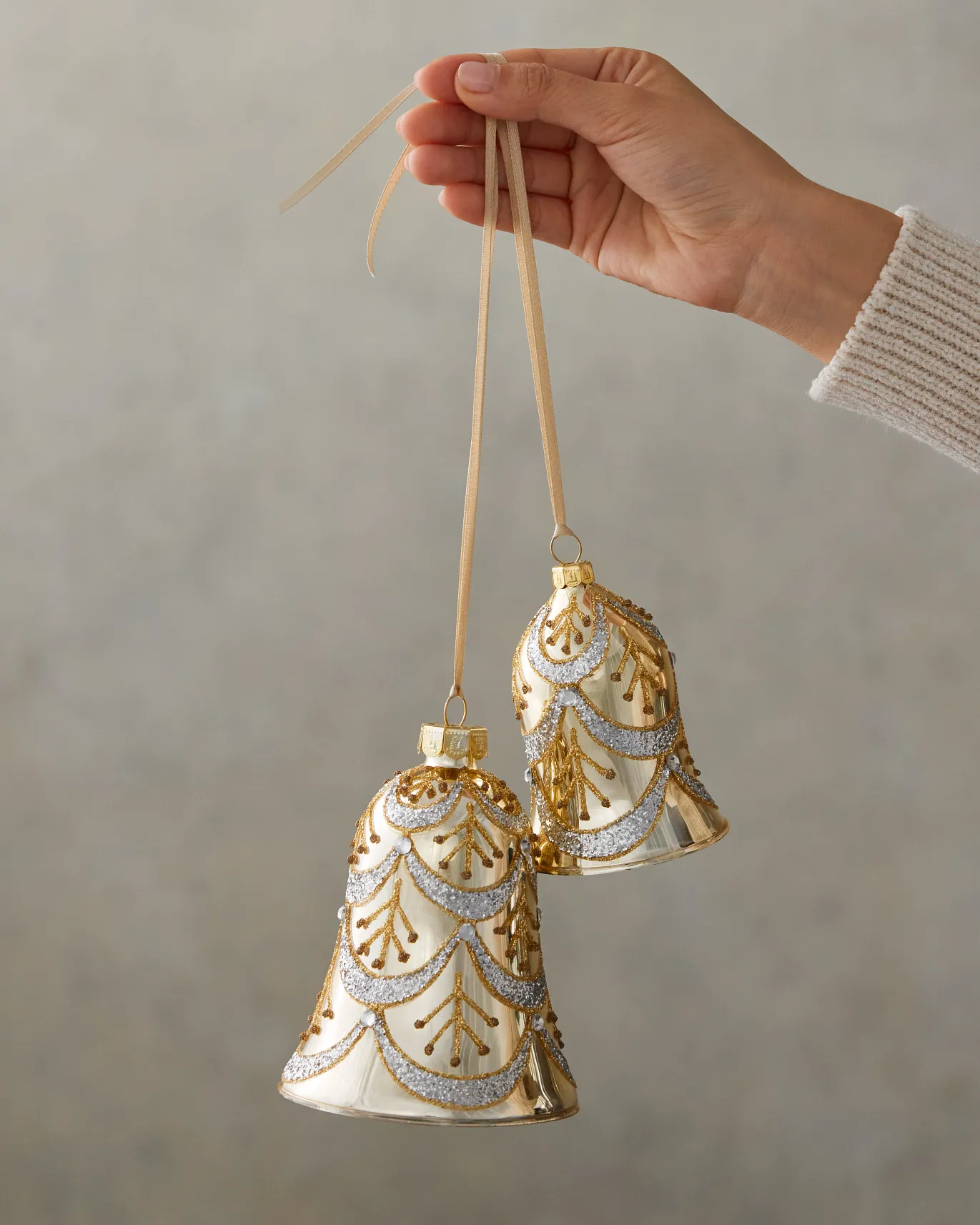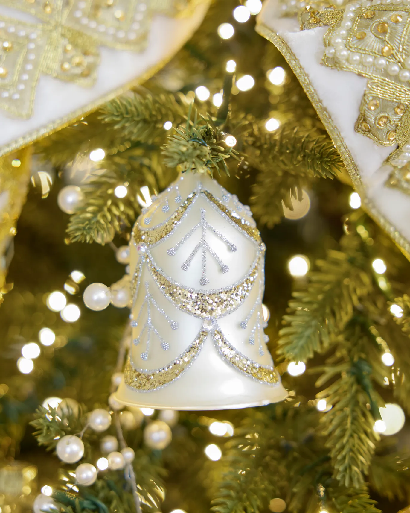 - Includes four large and four small bells in an ivory and gold palette, embellished with glitter and beads