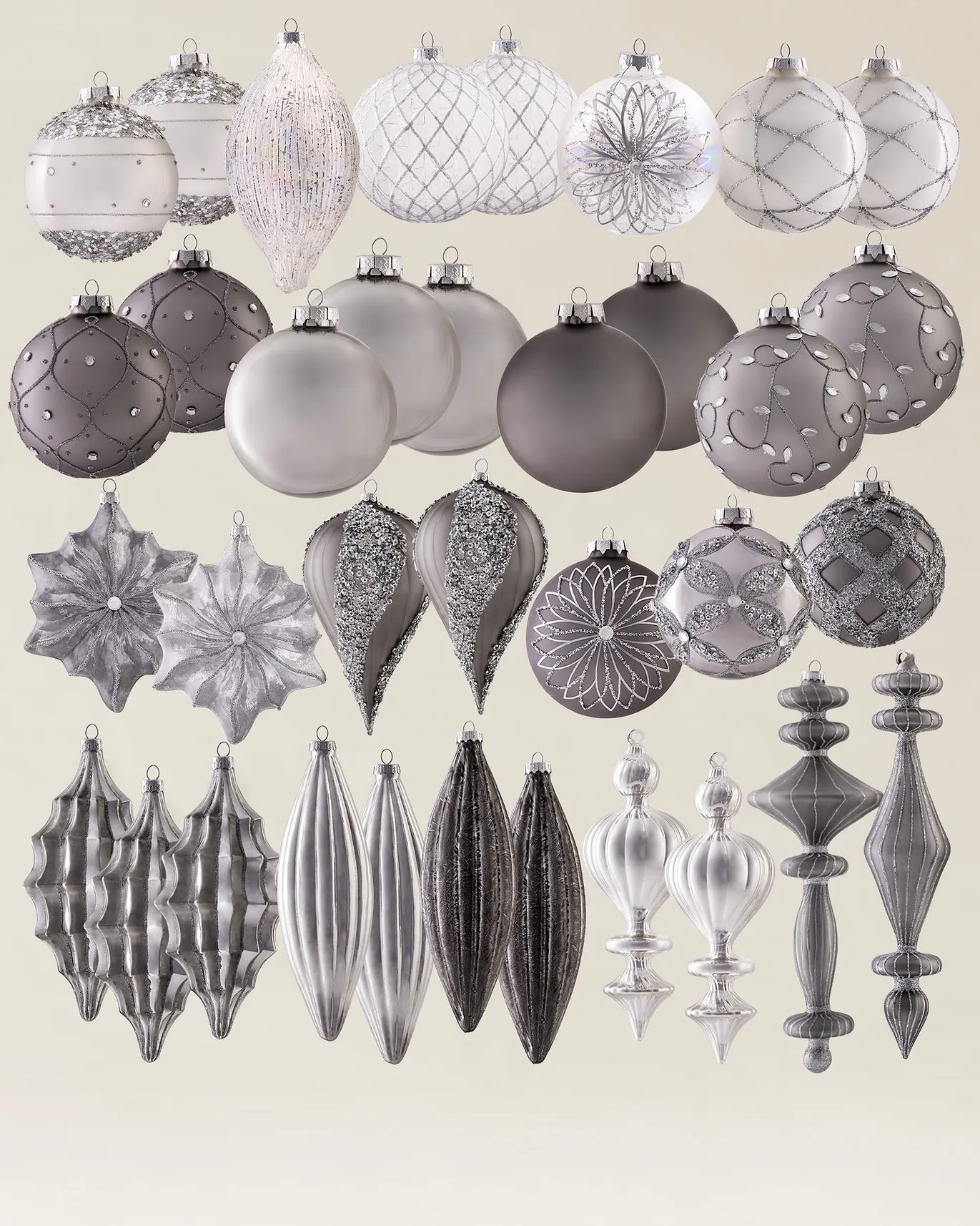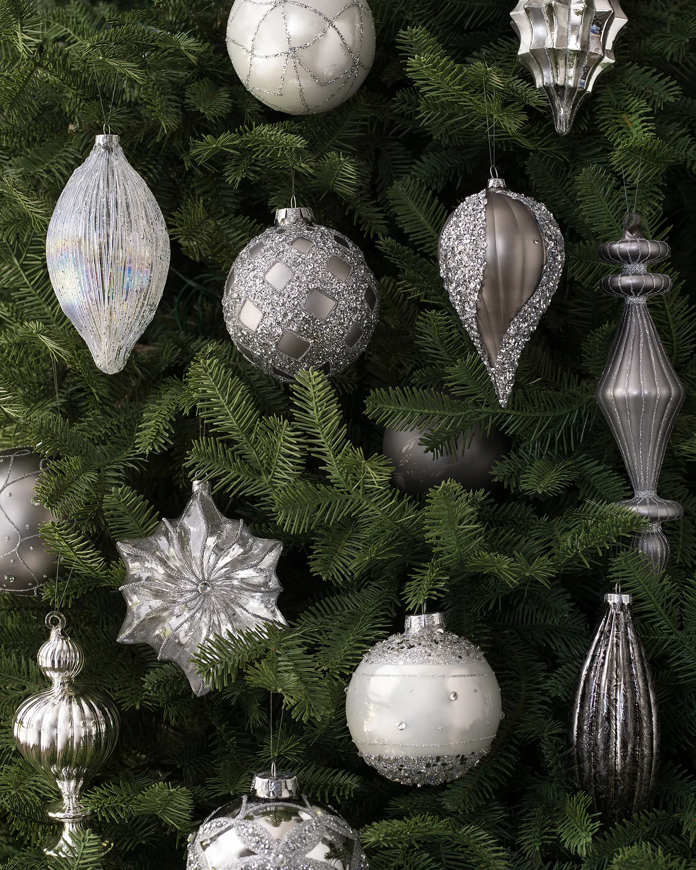 Make your Christmas tree sparkle with glass ornaments that shimmer beautifully as they catch the light. Pair with coordinating silver and crystal accents to create an elegant metallic winter theme.