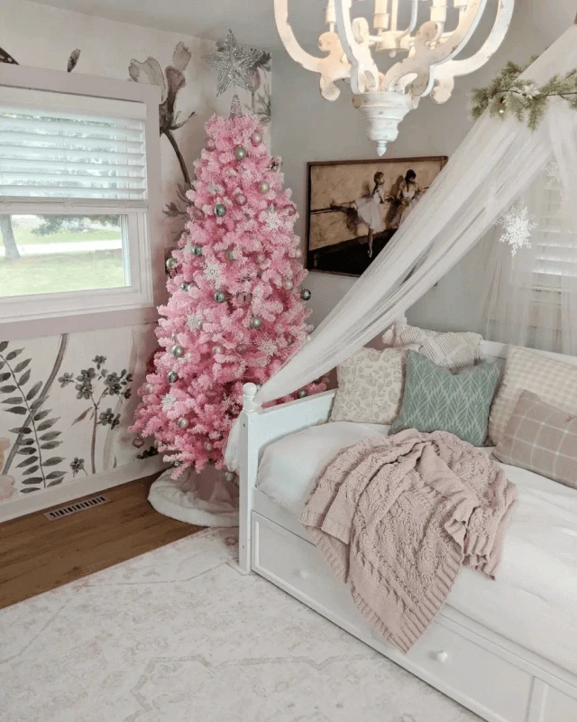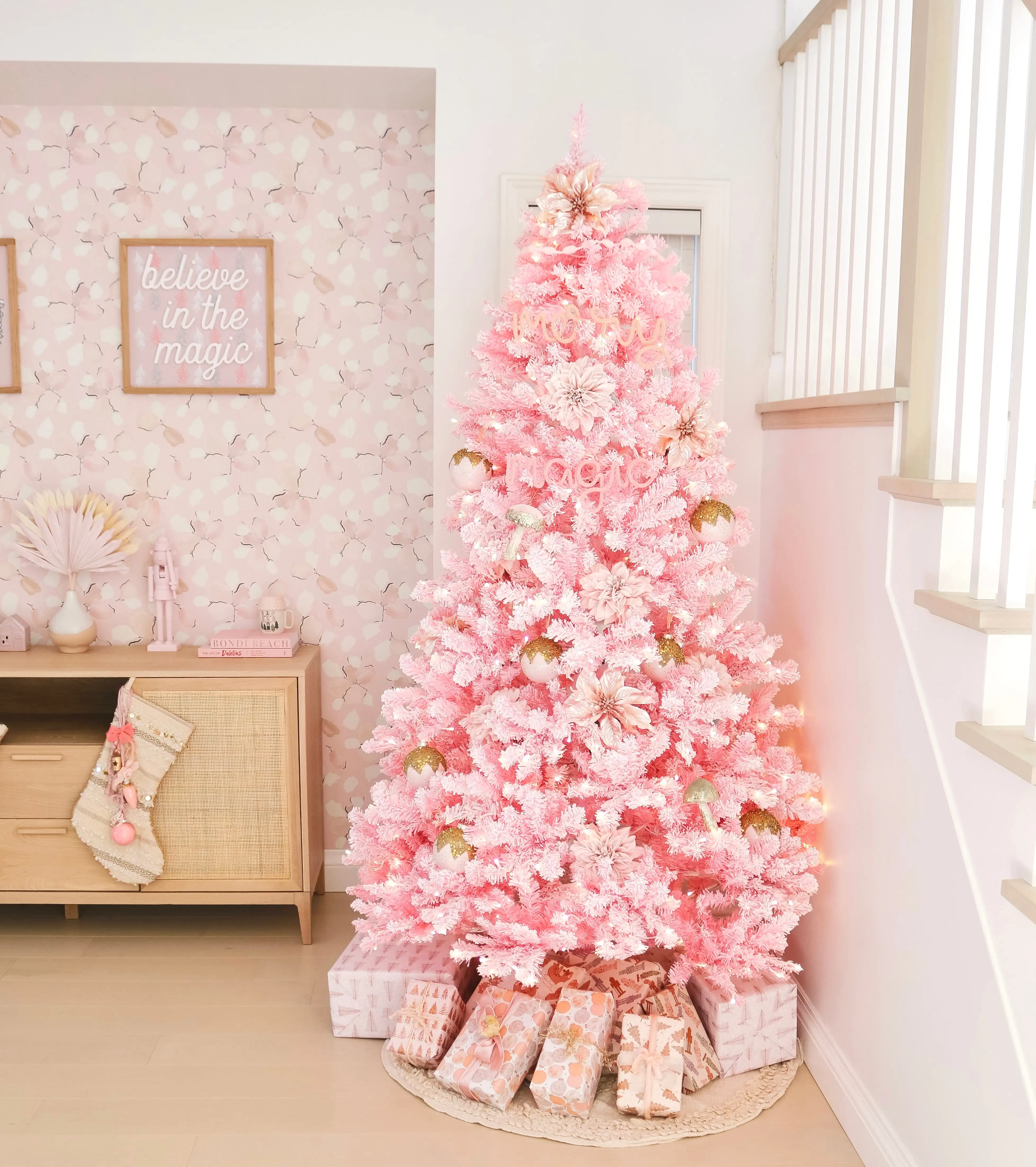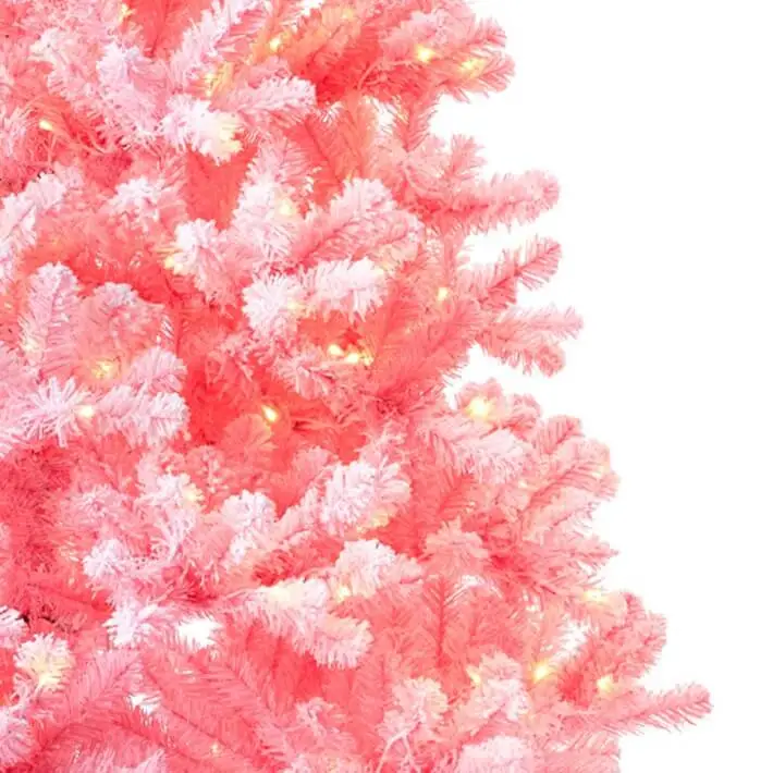 Welcome in the holiday spirit when you turn on the lights to our pre-lit pretty in pink flocked Christmas tree this season. This vogue tree resembles a light freshly fallen coat of snow, making it an exciting addition to your winter wonderland home. All our pre-lit trees are hand-strung to minimize the appearance of wires, and hinged sections for a seamless setup. Sit in awe with your family and enjoy the glow filled pink flocked tree.