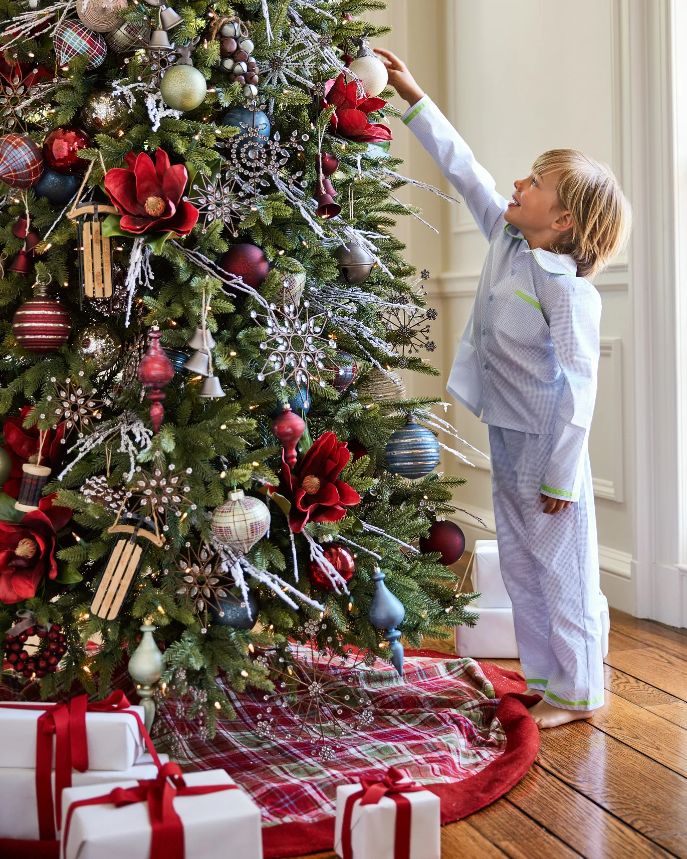 - Feature mouth-blown glass ornaments in red, blue, and green hues with glitter finish and plaid patterns