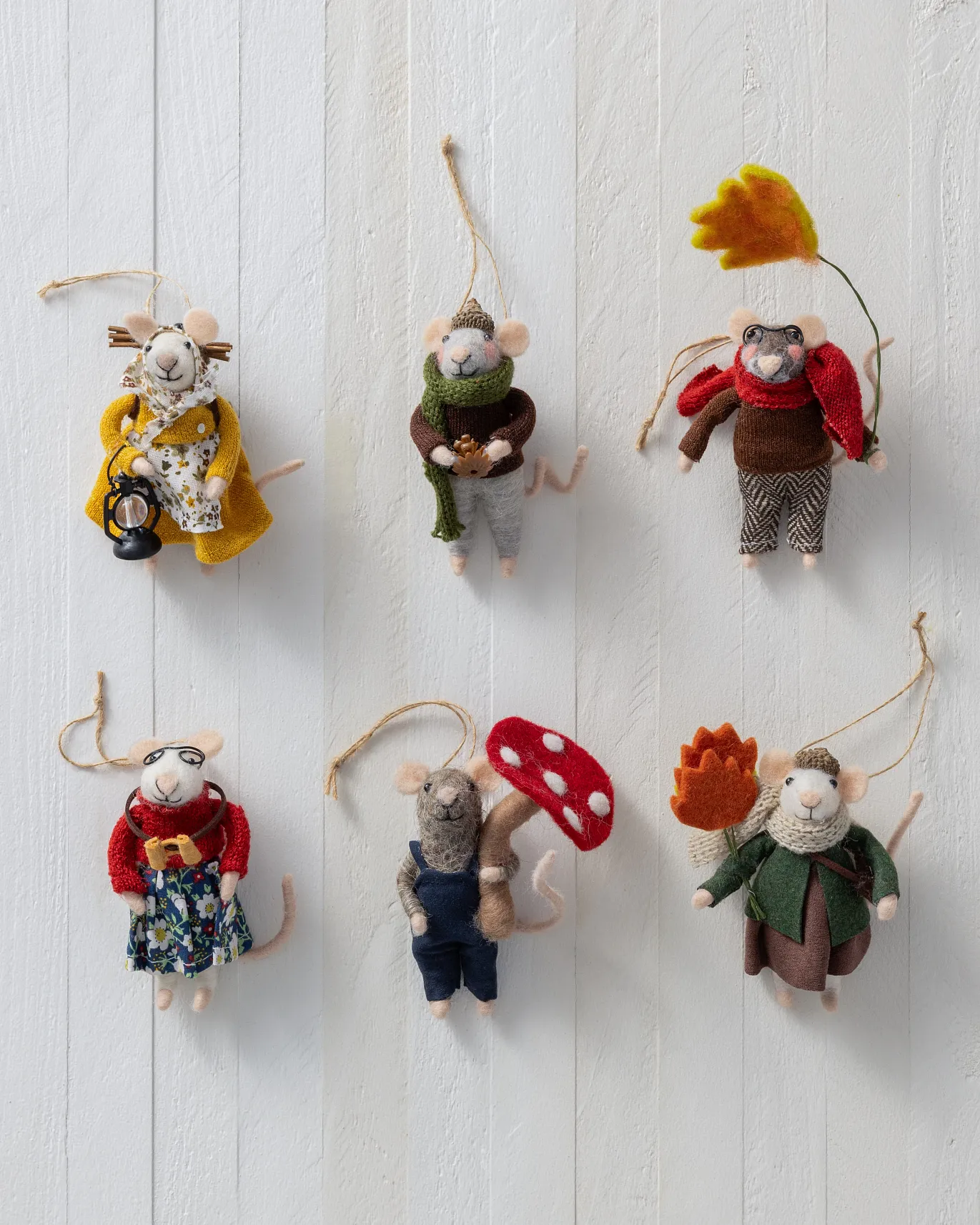 - Feature felt mice with a mushroom, a pinecone, a gas lamp, leaves, and binoculars