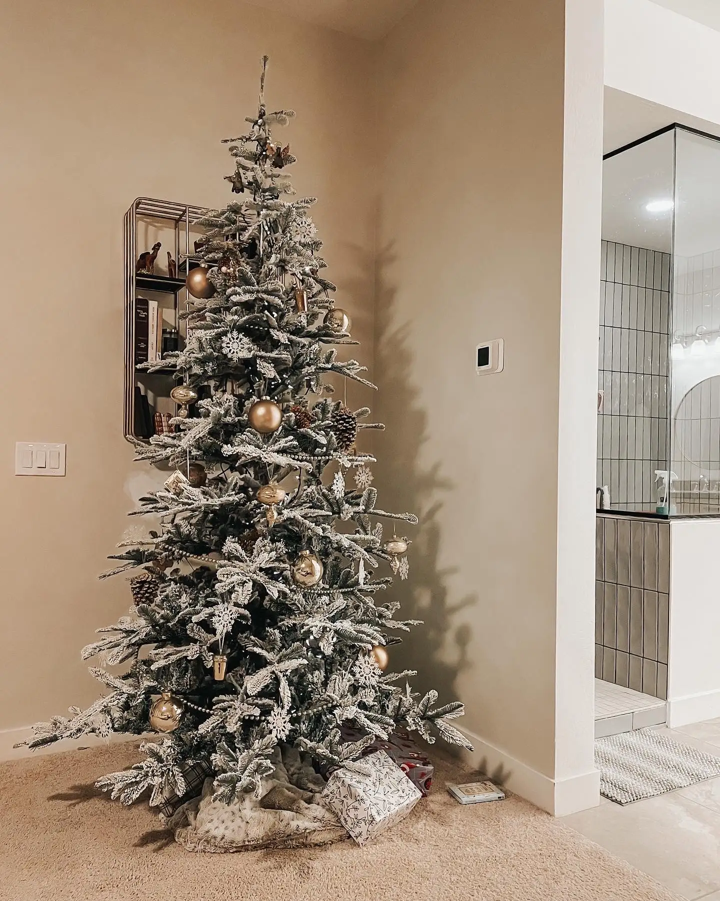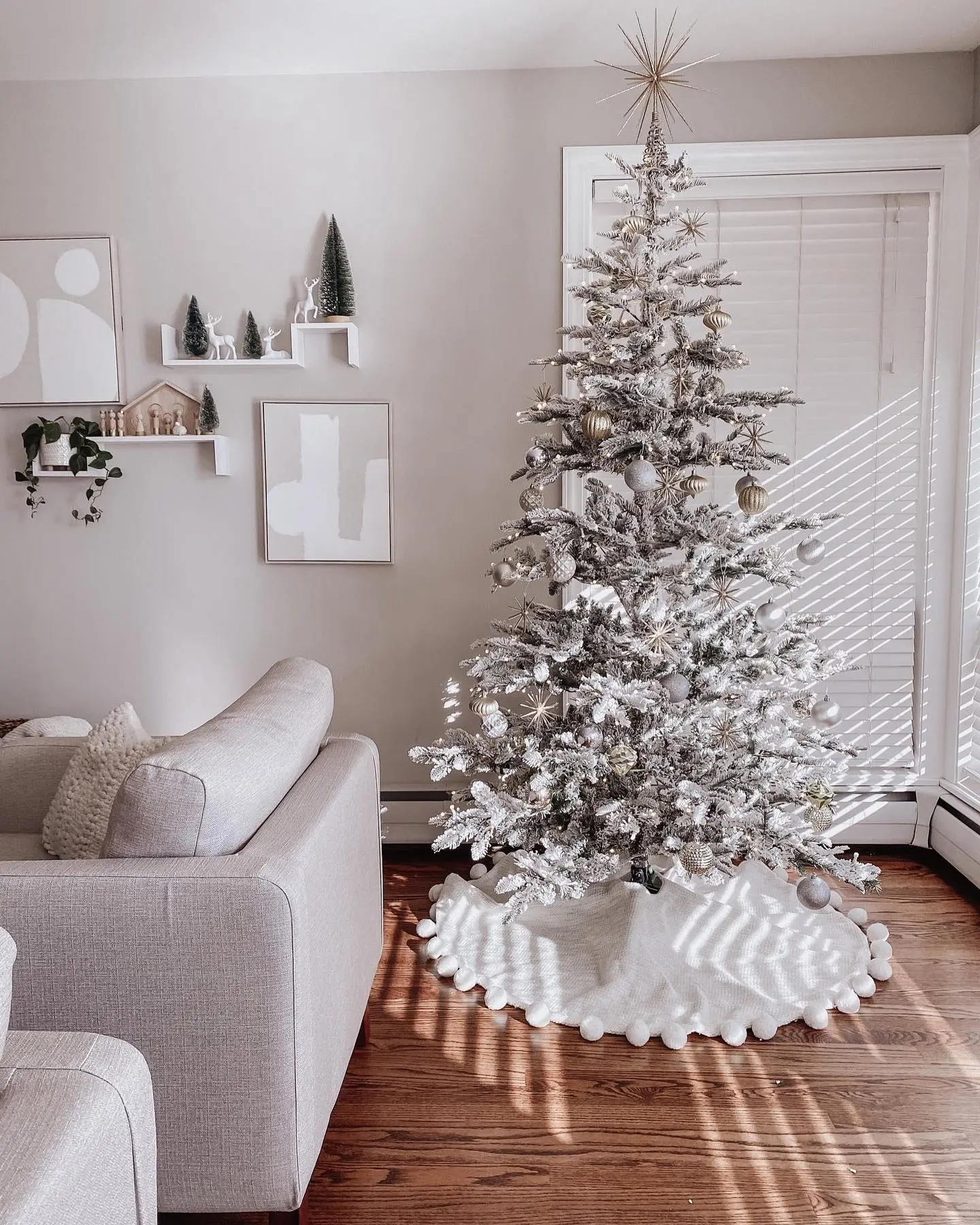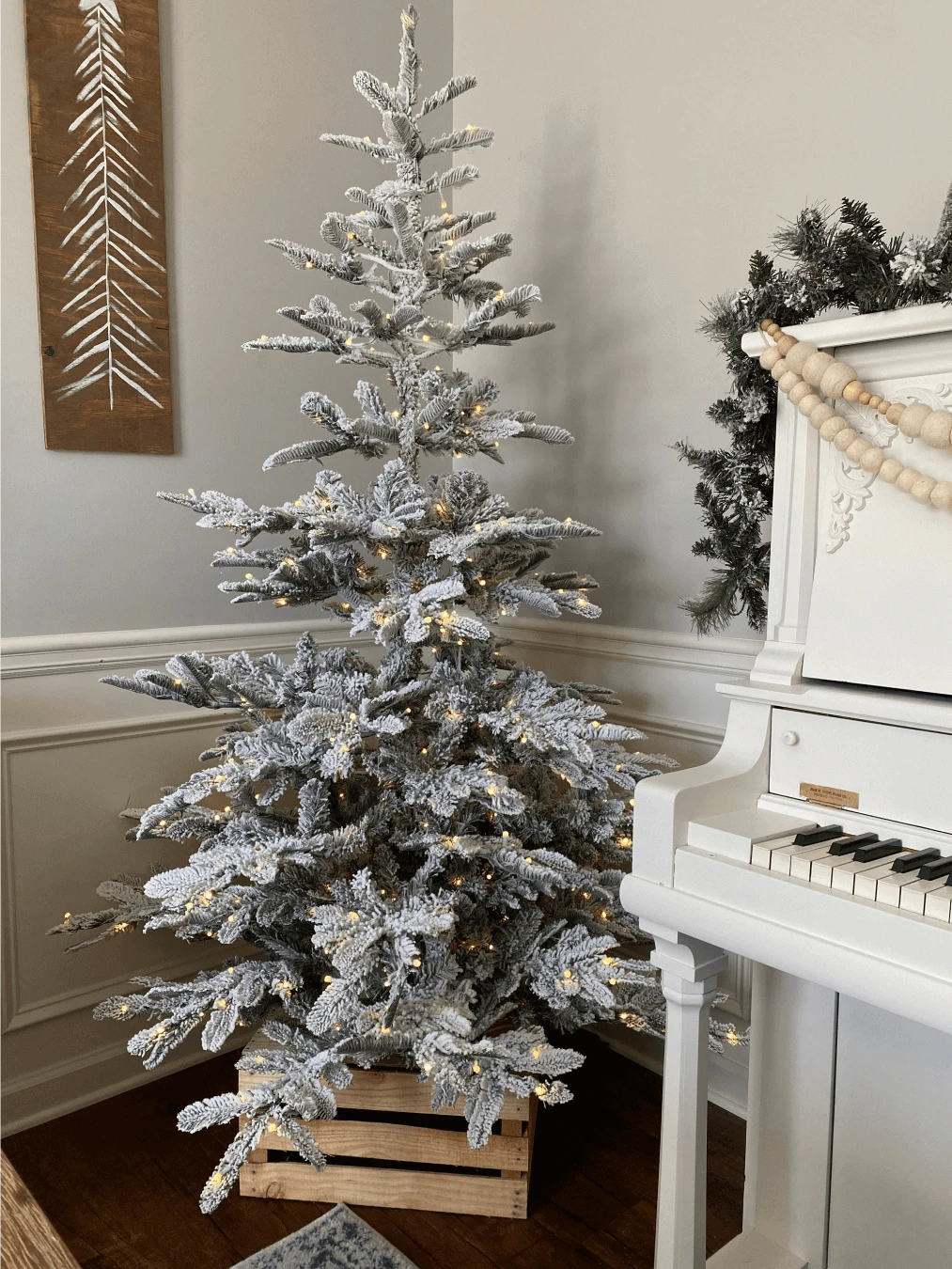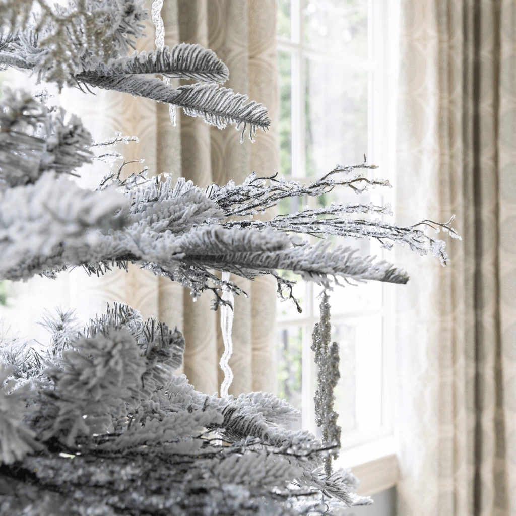 This 7' King Noble Flock comes pre-lit with 500 meticulously placed warm white LED lights. All of our pre-lit Christmas trees are skillfully hand-strung to camouflage the appearance of wires. With hinged sections and a sturdy folding metal stand, setting up your tree will be a quick, simple process. You'll also receive a storage bag to securely store your tree for seasons to come.