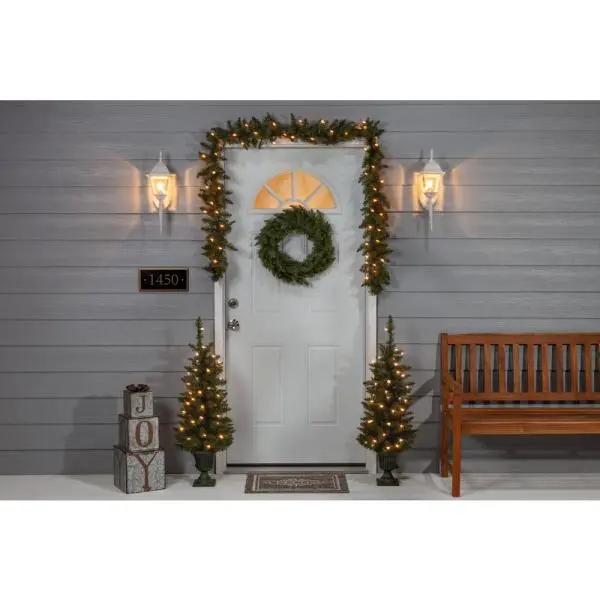 This 4-Piece set is ideal for decorating your front door or fireplace. The pair of potted pre-lit trees sit on either side of the doorway or fireplace, the wreath hangs on the door or above the mantel and the 9 ft. Pre-lit garland goes around the doorframe or across the mantel. Everything is included to complete your holiday decorating of the area.