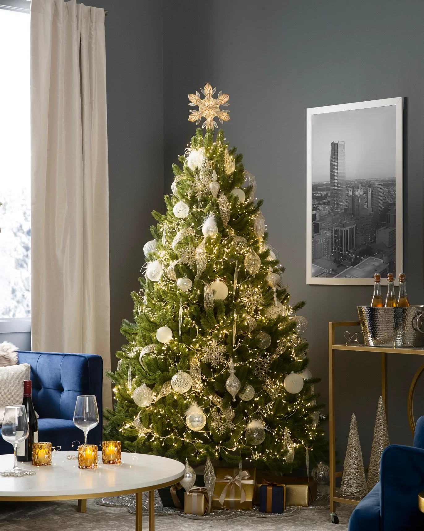 - Feature assorted white and clear glass bulbs, balls, and finials with glitter accents