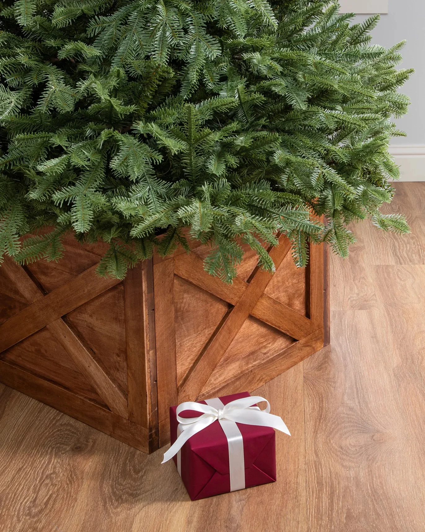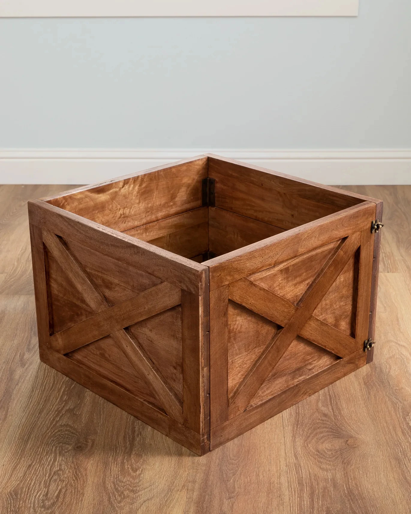 Give your tree a modern farmhouse look with this stylish tree collar. Hinged panels easily interlock to protect the bottom part of your tree while making your display stand above the rest.